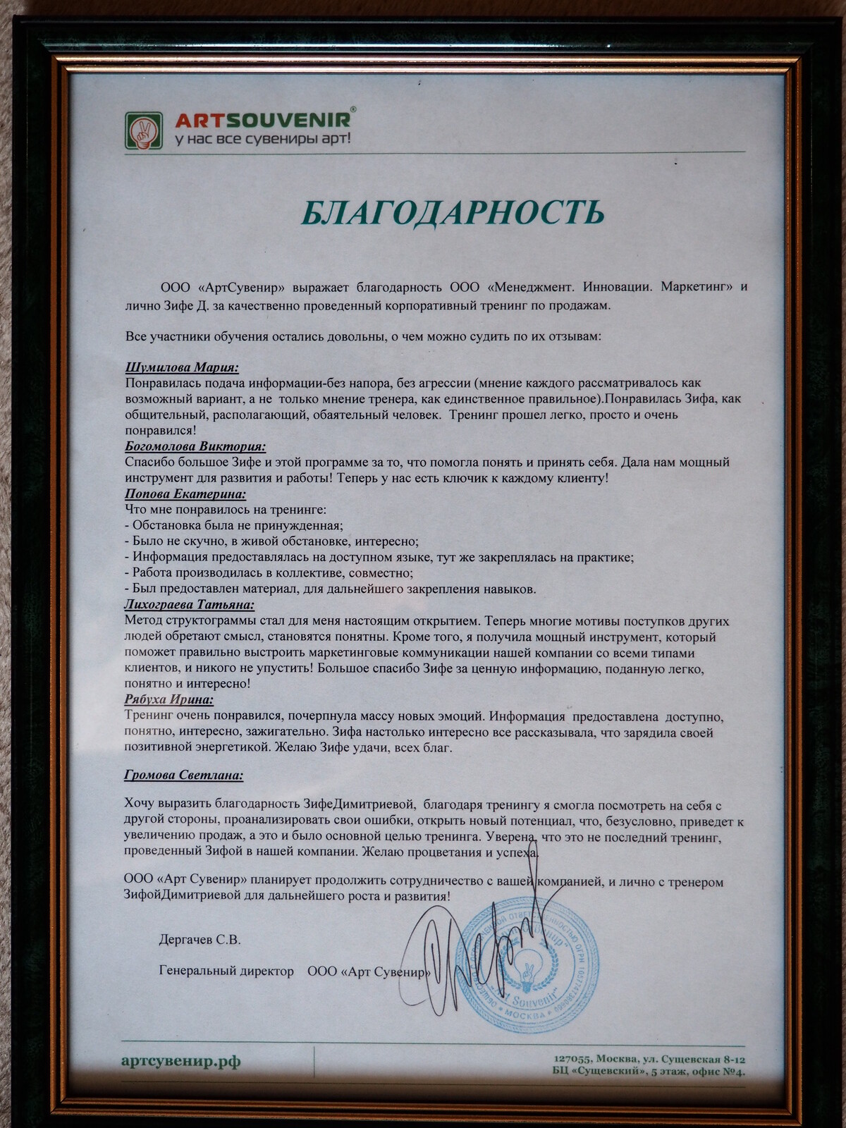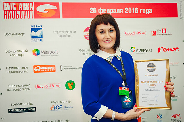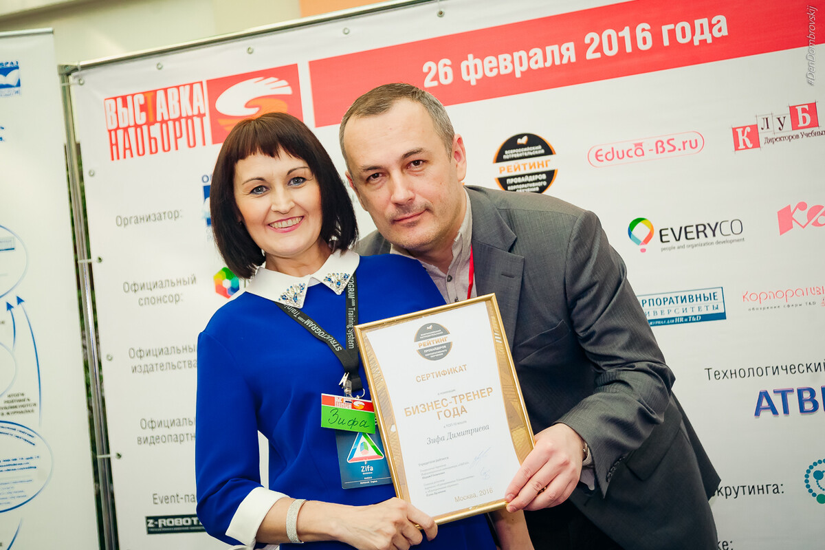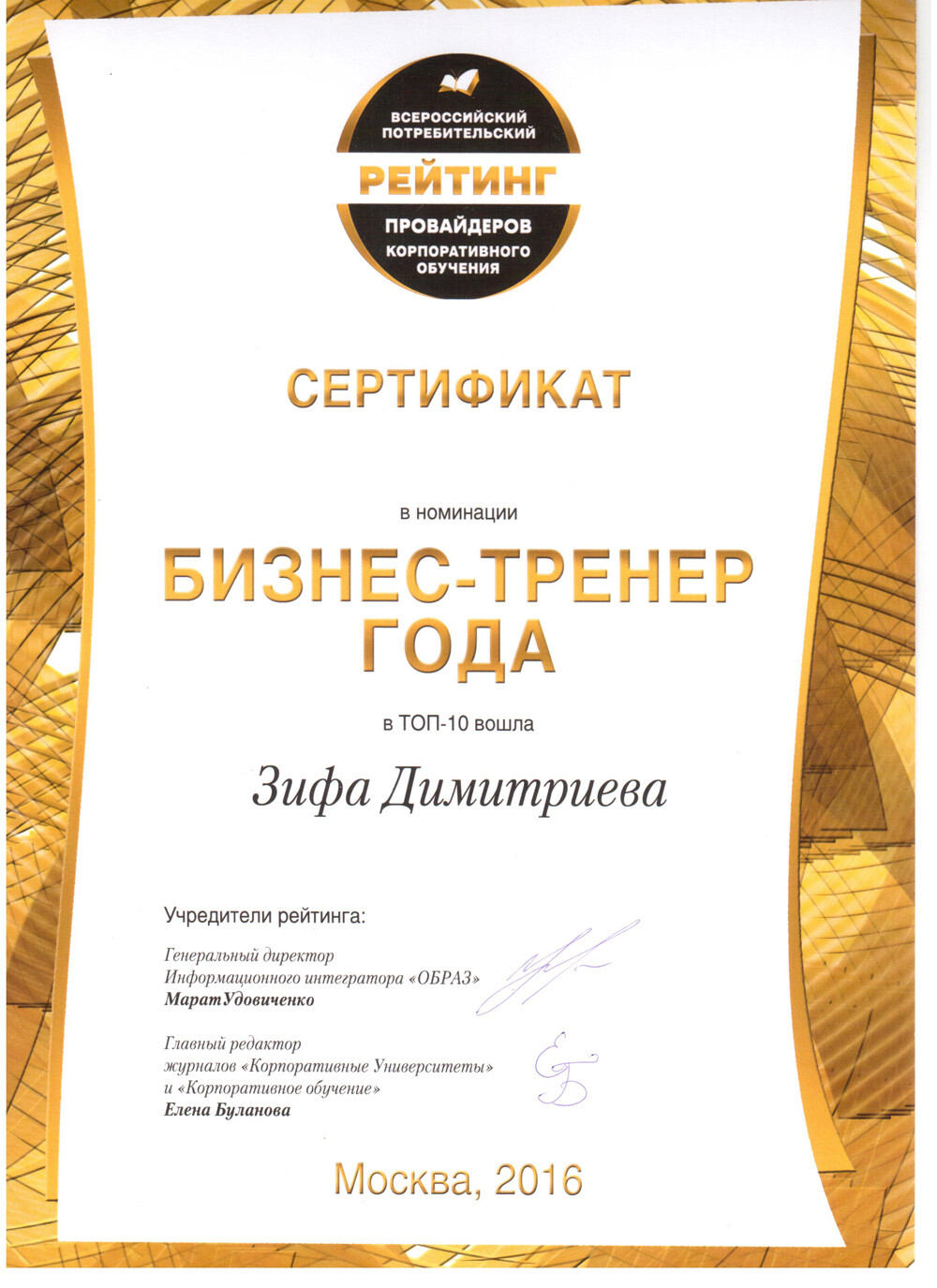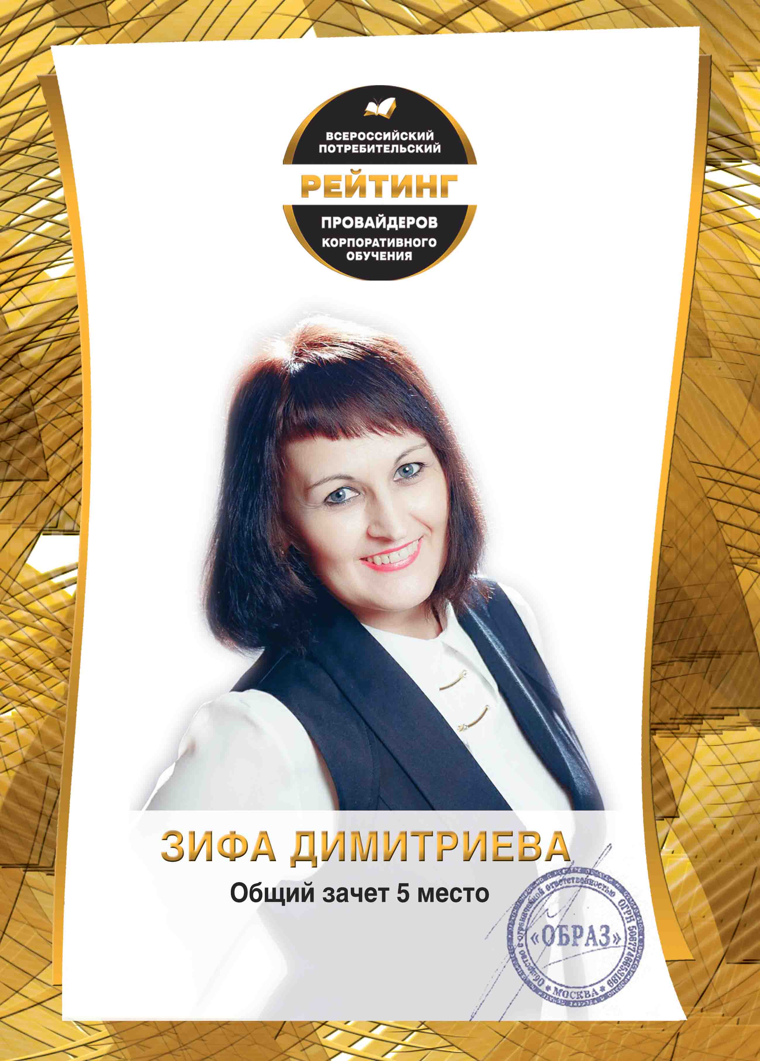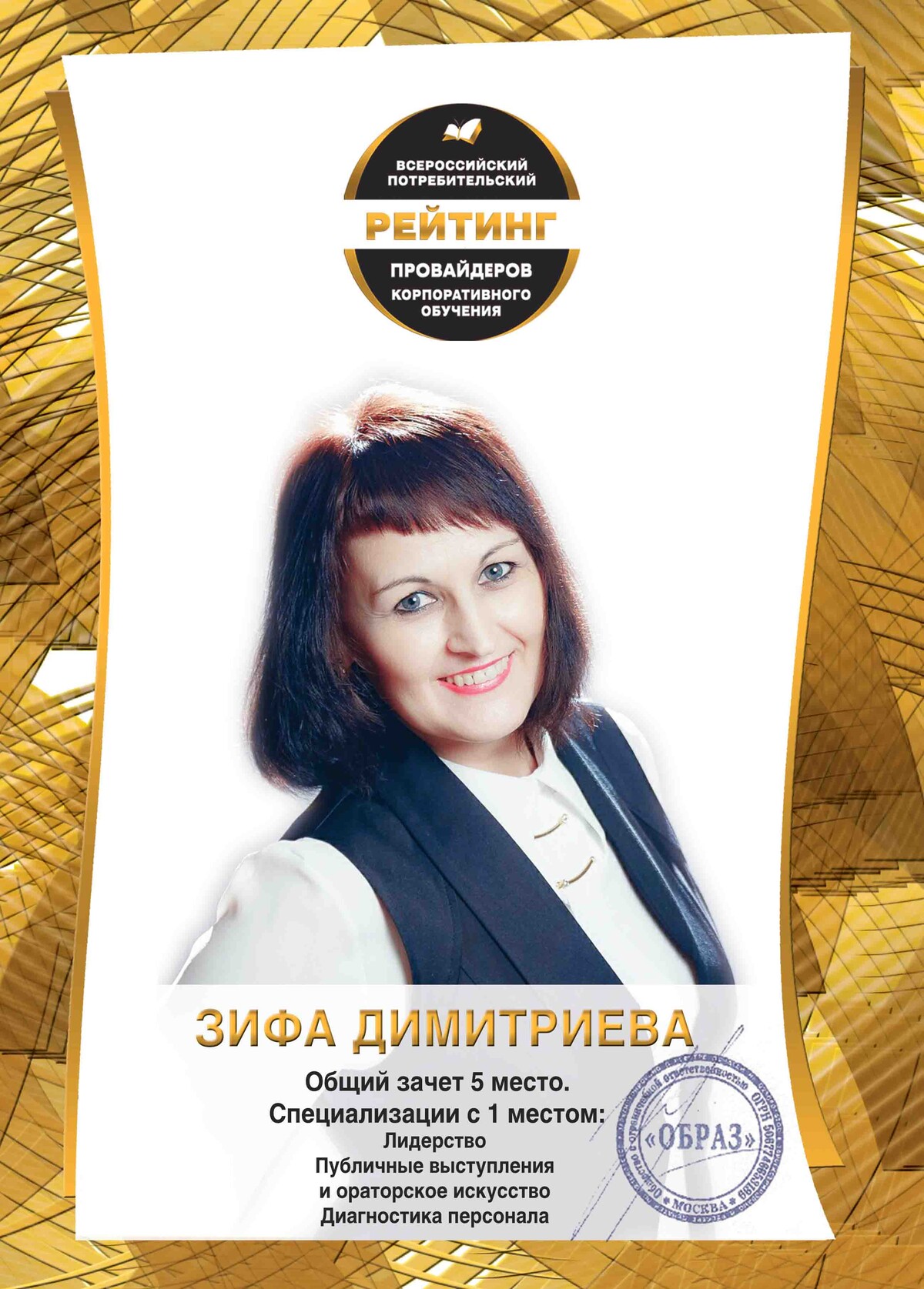 Зифа Димитриева — единственная в России, двухкратный победитель Всероссийского независимого потребительского рейтинга провайдеров корпоративного обучения в номинации «Управленческие краткосрочные тренинги».
