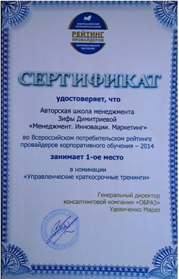 Авторский курс бизнес-тренера Зифы Димитриевой «Открытая школа менеджмента «Счастливый руководитель» — победитель Всероссийского потребительского рейтинга провайдеров корпоративных услуг в номинации «Самая востребованная программа».